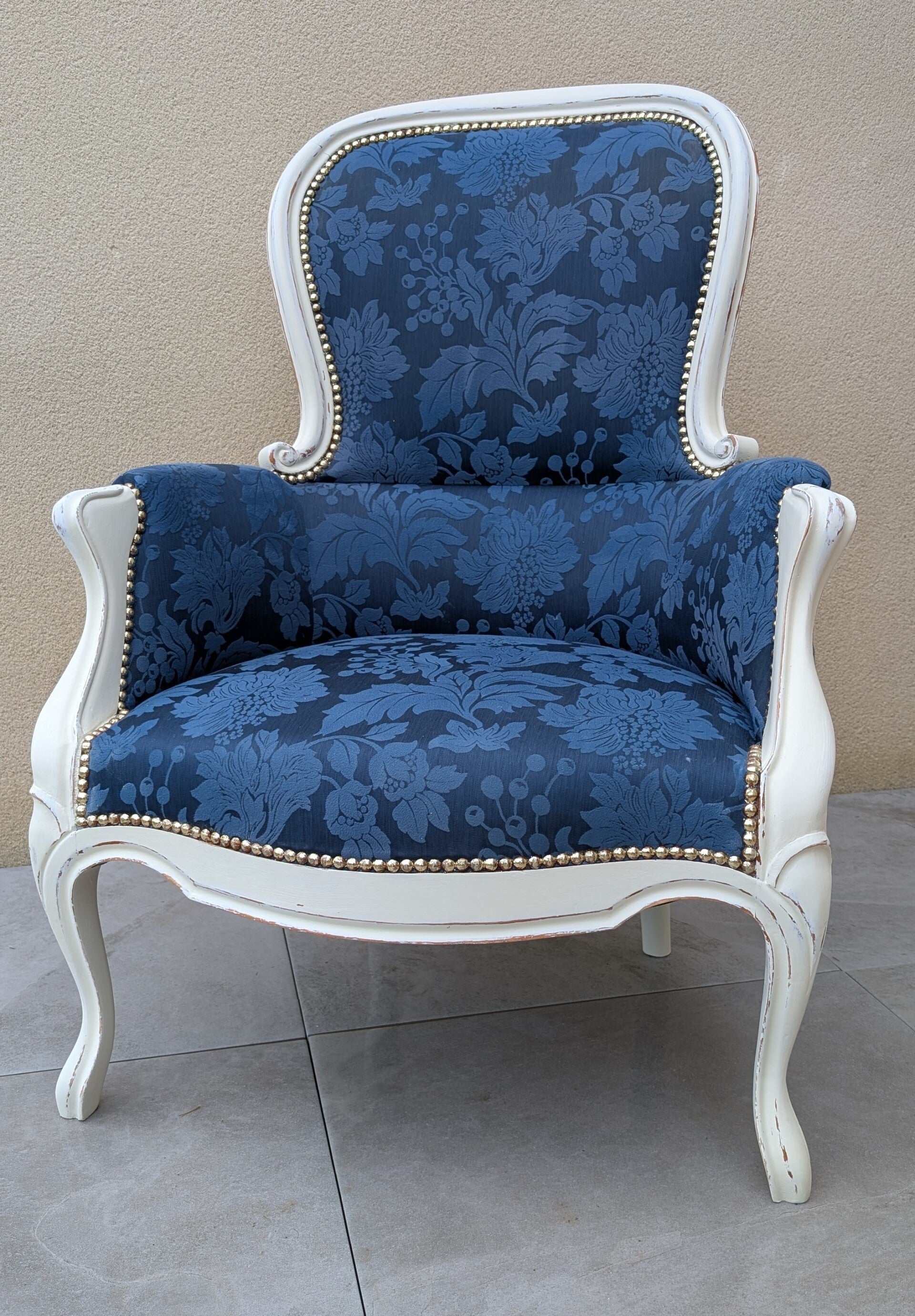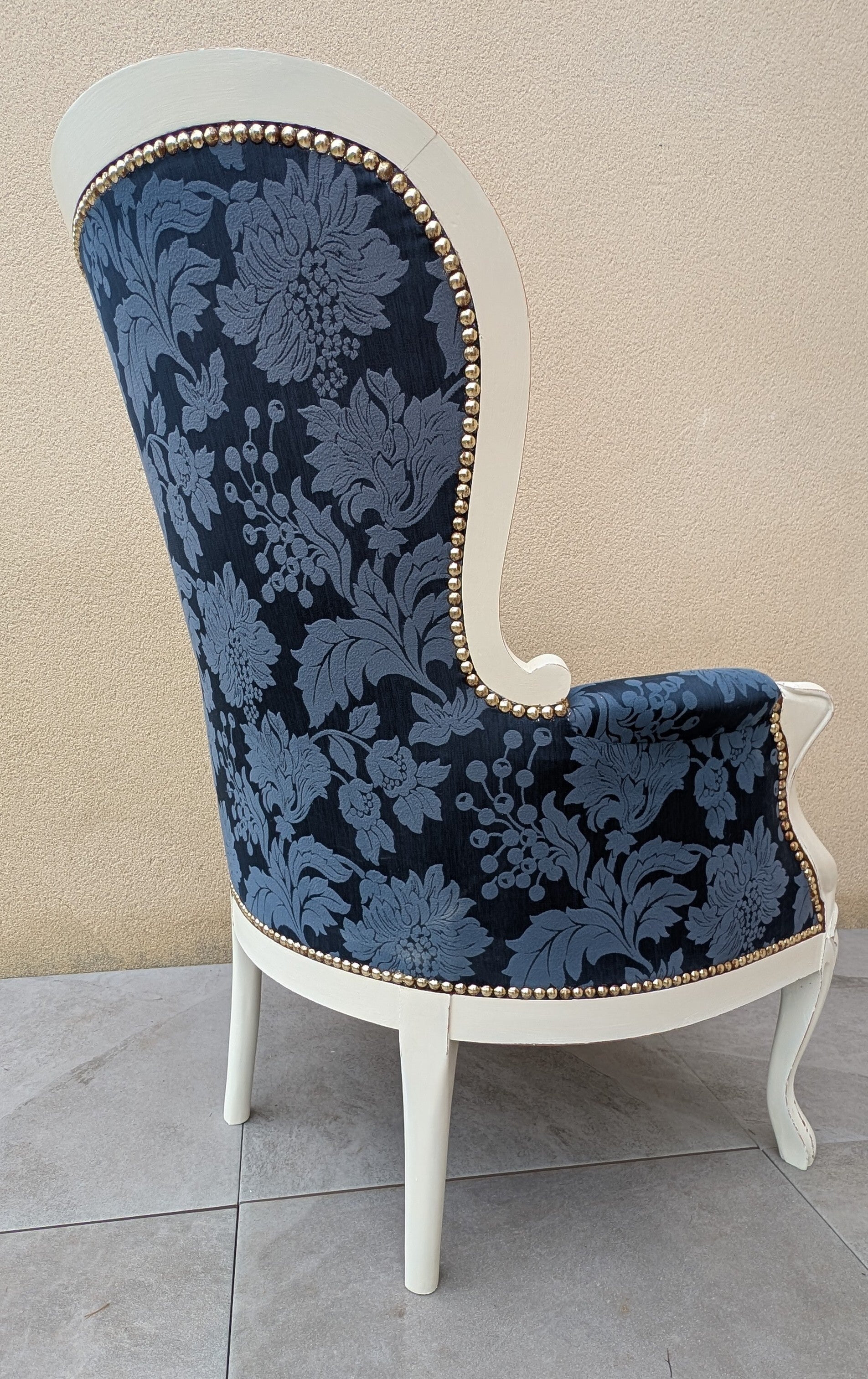 Les assises et dossiers sont habillés de leur tissu damassé bleu d’origine, au motif floral riche et élégant. Conservé volontairement pour préserver l’authenticité de l’ensemble, ce textile est en très bon état général, présentant une légère patine d’usage, discrète et homogène, témoin du temps et du caractère de la pièce, sans altérer l’esthétique ni le confort.